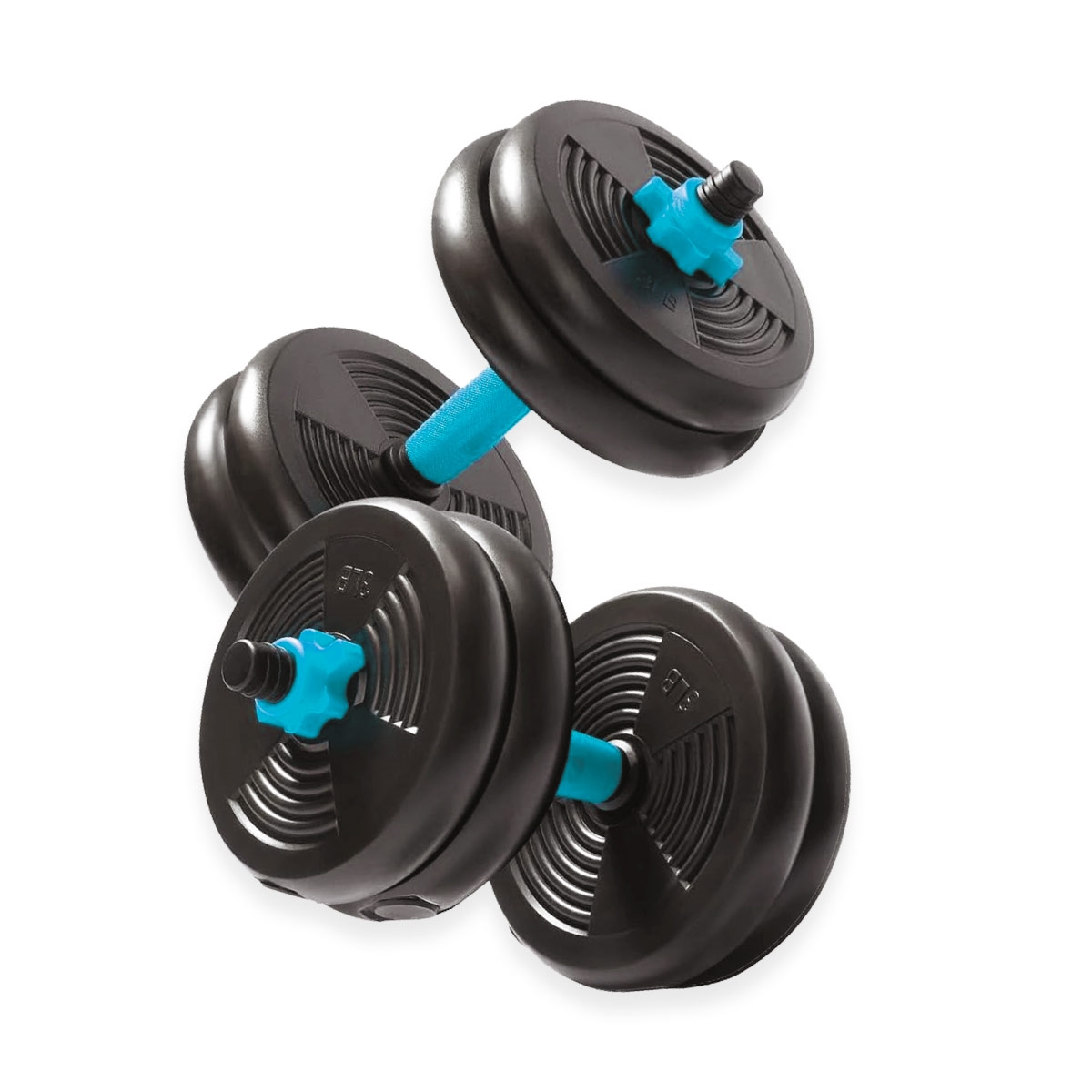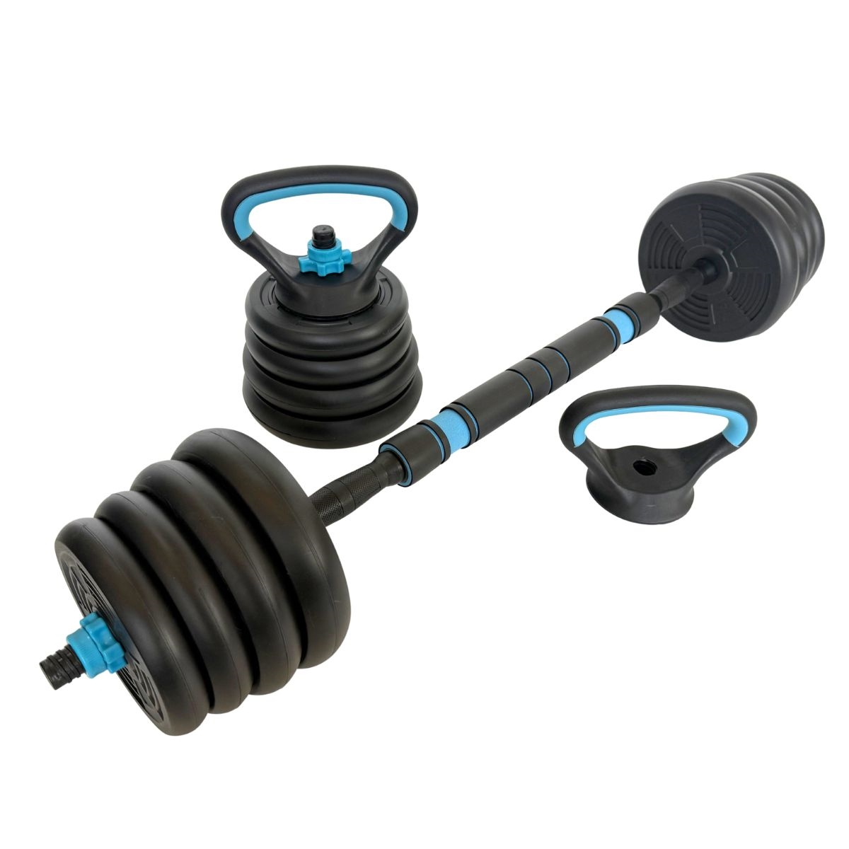 Satsen består av 29 kg viktskivor (1,25 kg, 1,5 kg, 2 kg och 2 kg – fyra av varje), två korta skivstänger à 47 cm som kan användas som hantlar eller sättas ihop till en lång skivstång med det medföljande 40 cm kopplingsstycket. Du får också med en kettlebell-stång med basdel samt två push-up-handtag som även fungerar som grepp för kettlebell-uppsättningen. Fyra låsringar håller vikterna säkert på plats under träning.