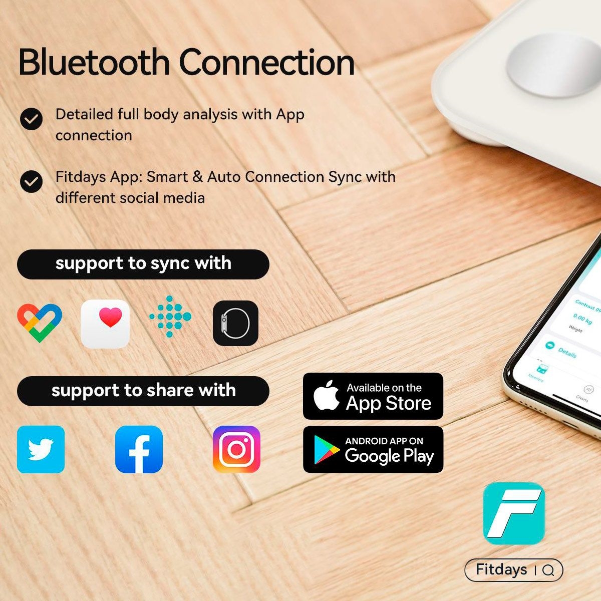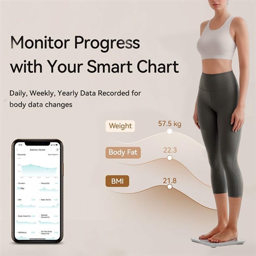 Synkronisera dina data automatiskt via Fitdays-appen och följ din kroppsutveckling direkt i mobilen.