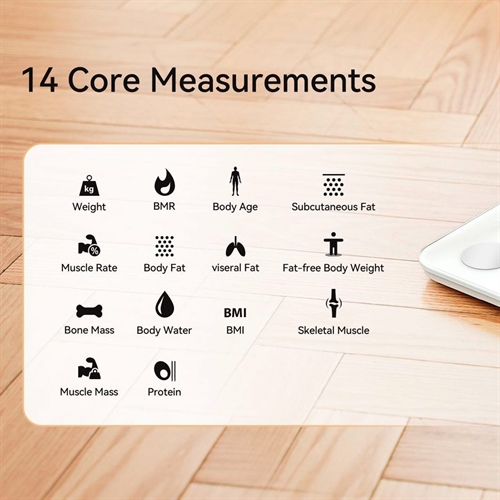 Få exakta mätningar av kroppsfett, BMI, muskelmassa, vattenprocent, benmassa och mycket mer – totalt 14 nyckelparametrar.