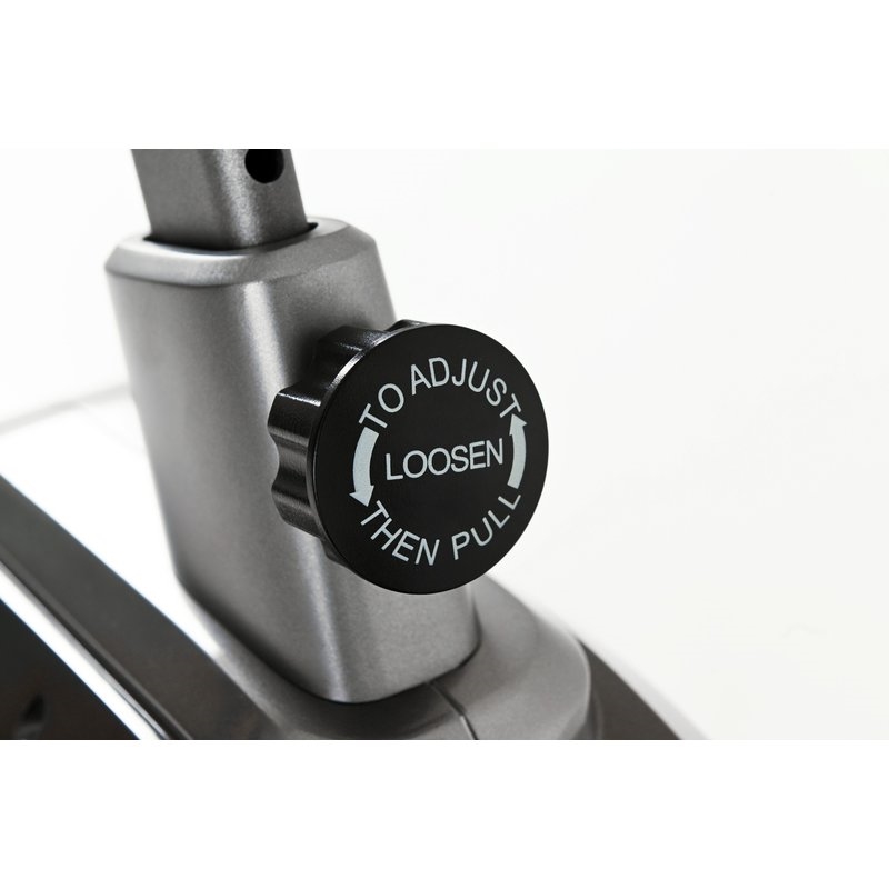 Sadeln kan justeras både vertikalt och horisontellt, och styrets vinkel kan anpassas för optimal sittställning.