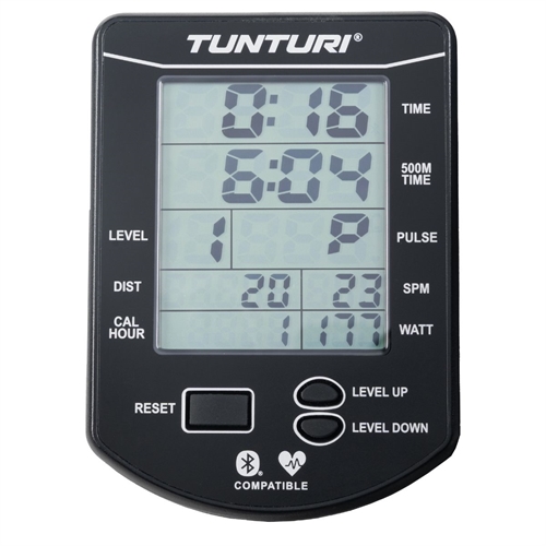 Följ tid, watt, kalorier, distans, tempo och dragfrekvens – och se valt motståndsnivå direkt på skärmen.